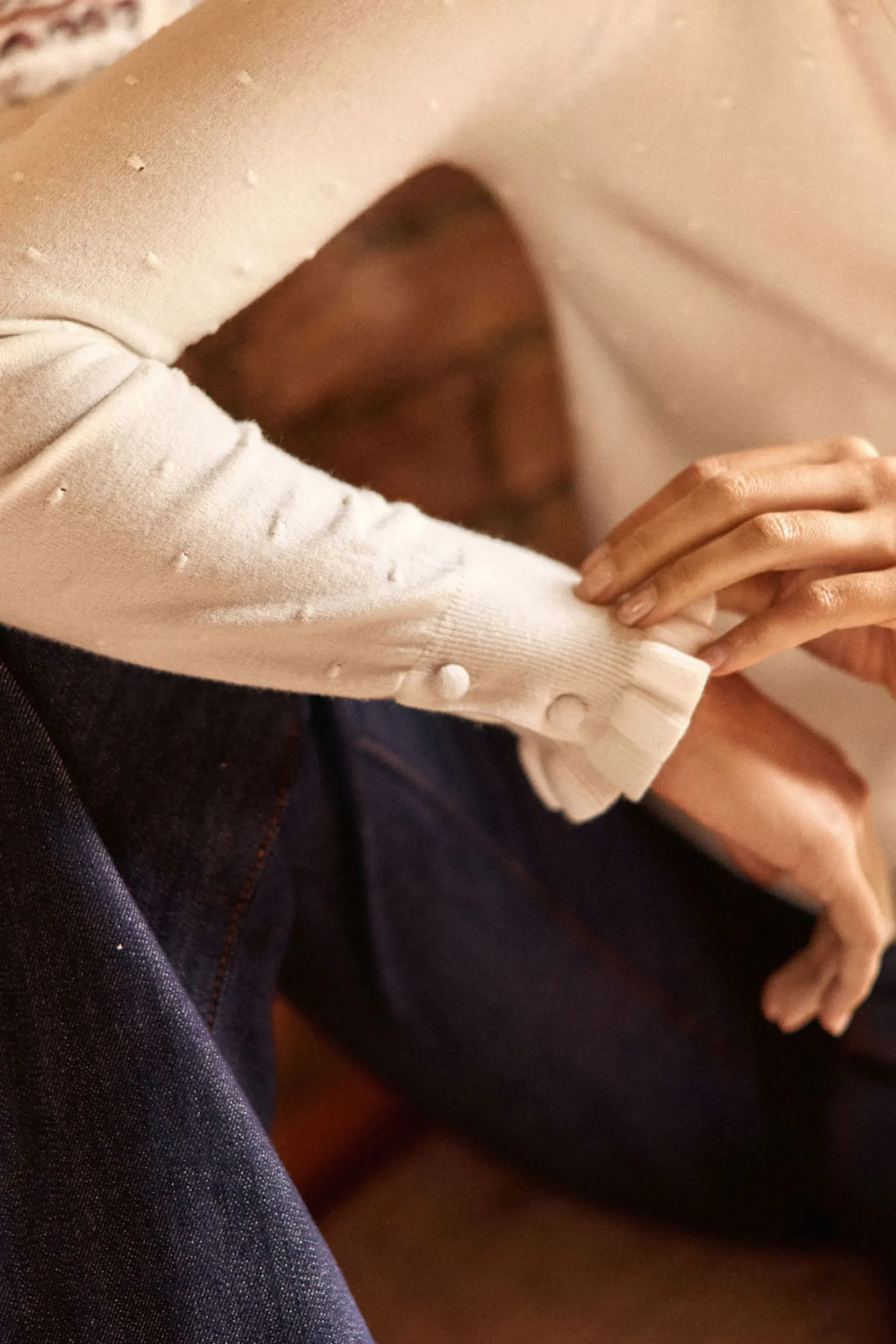 – Gilet à pois en relief ton sur ton- Coupe près du corps- Maille en viscose ultra douce- Boutonnage milieu devant ave…