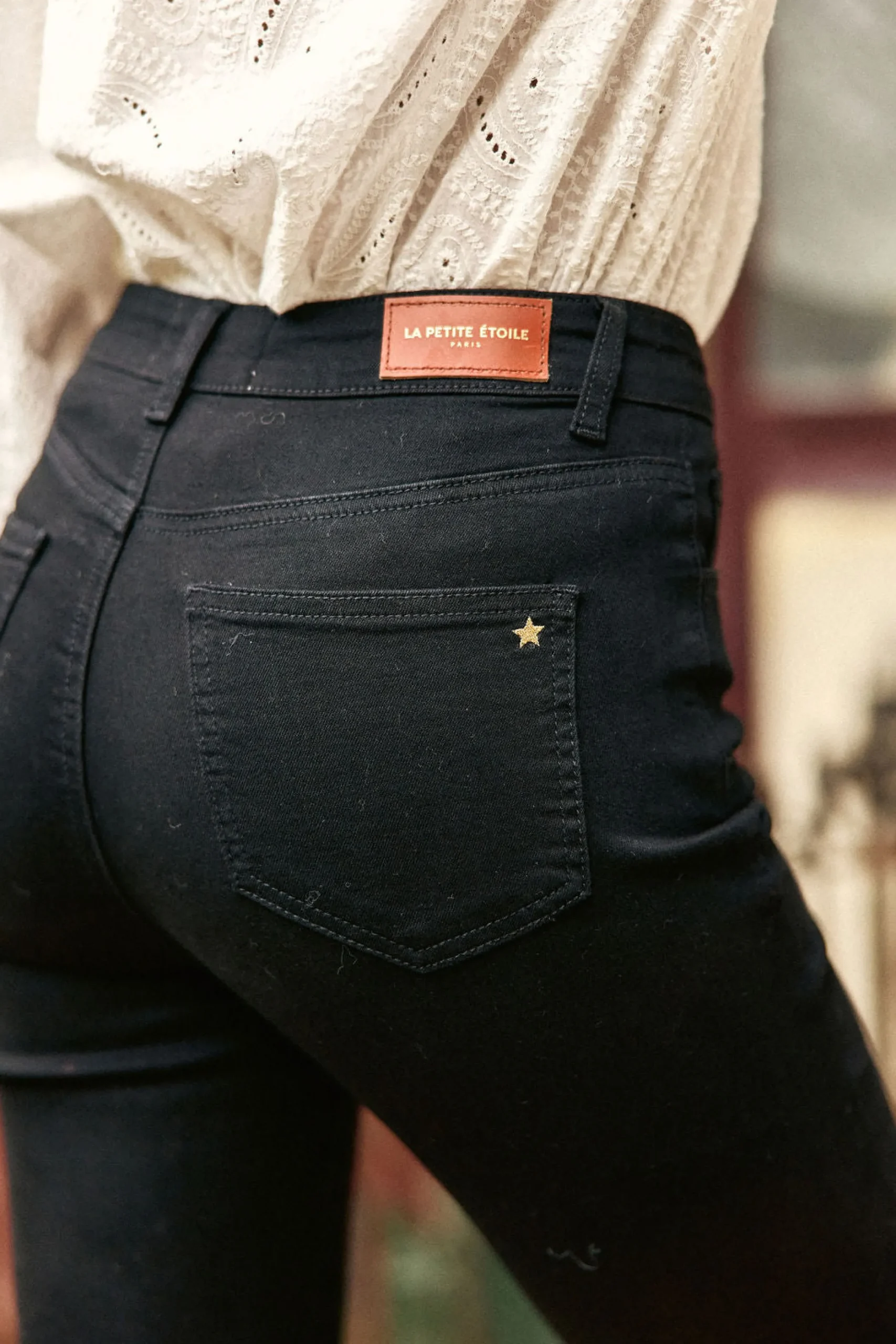 – Jean coupe flare- Taille haute- 5 poches- Fermeture zippée et bouton rivet devant- Jacron « LA PETITE ETOILE » à…